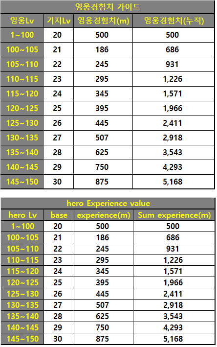 라스트 워 영웅경험치 1lv~150lv 표