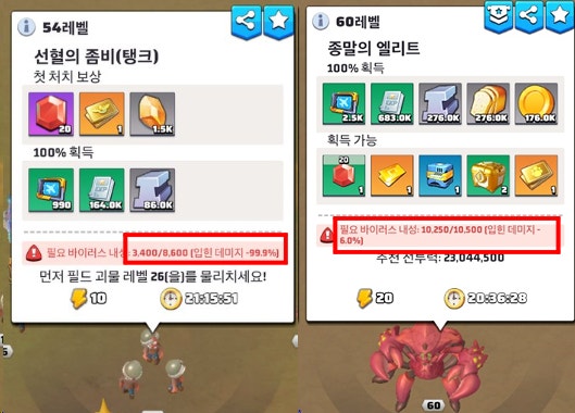 공격하는 창에서는 위의 이미지처럼 각 좀비의 바이러스 수치와 여러분의 내성을 비교해 주는데요.