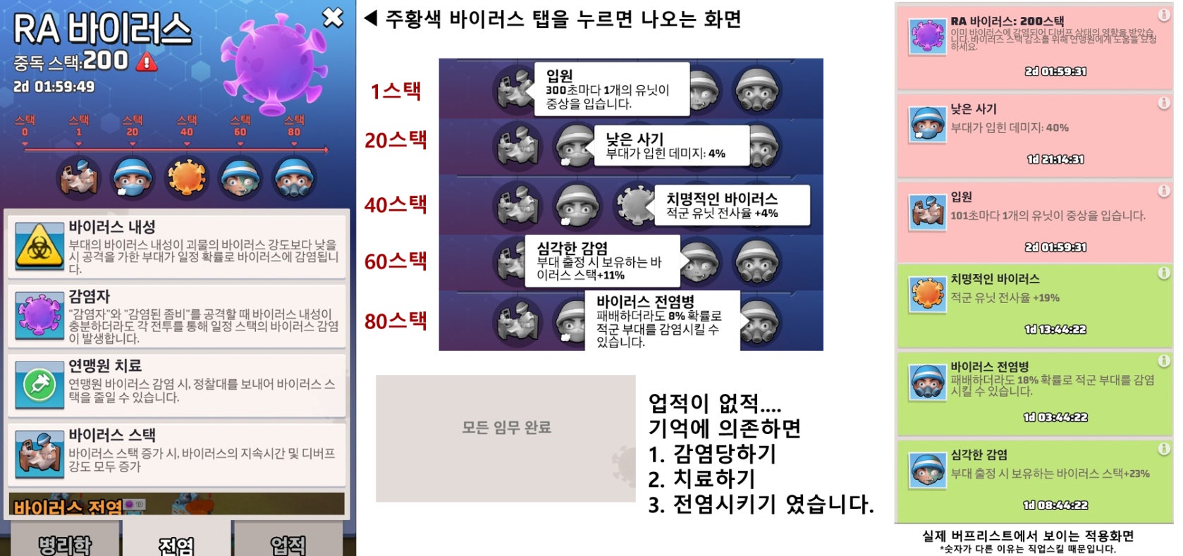 특히 전사율 증가를 가지고 있는 치명적인 바이러스가 가장 효율이 좋은 버프이기는 하나, 이것 외엔 크게 메리트가 되는 기능이 없다보니 스택은 쌓아서 가지고 계시는 것보단 그때그때 치료하는 걸 추천 드립니다.