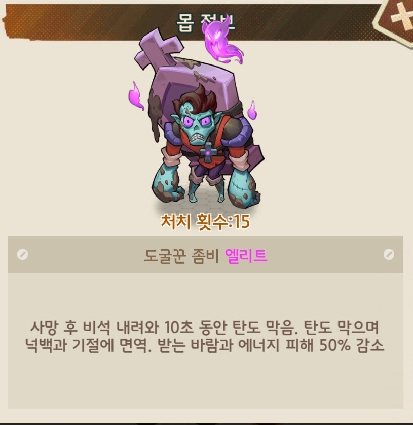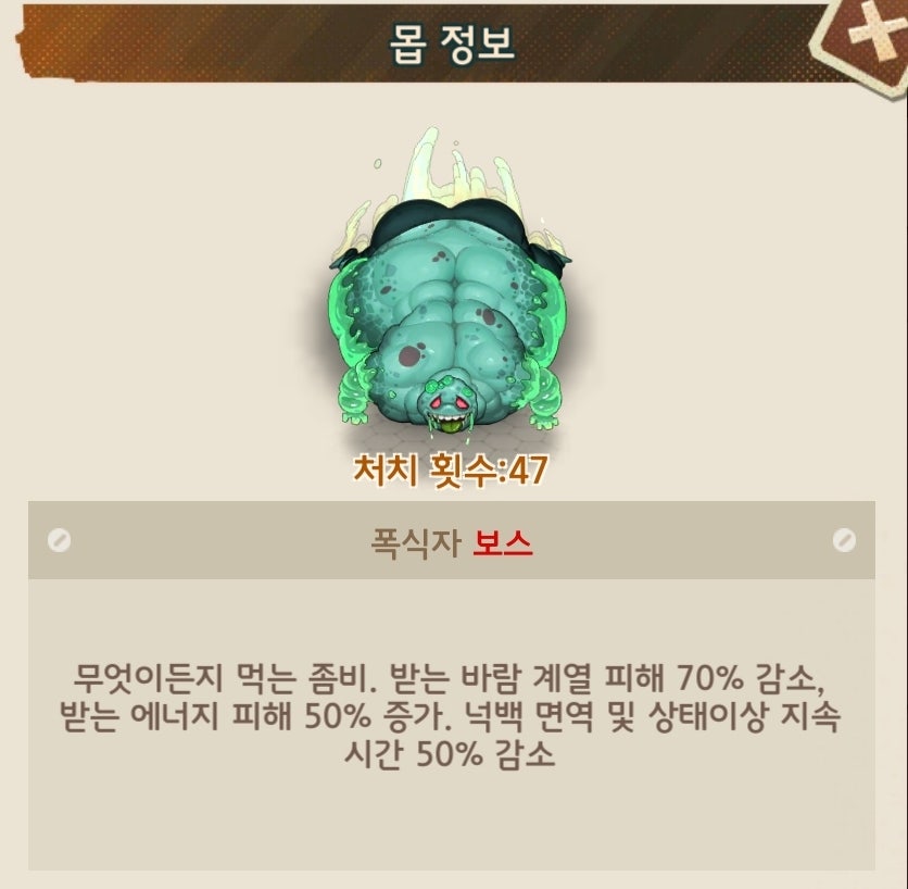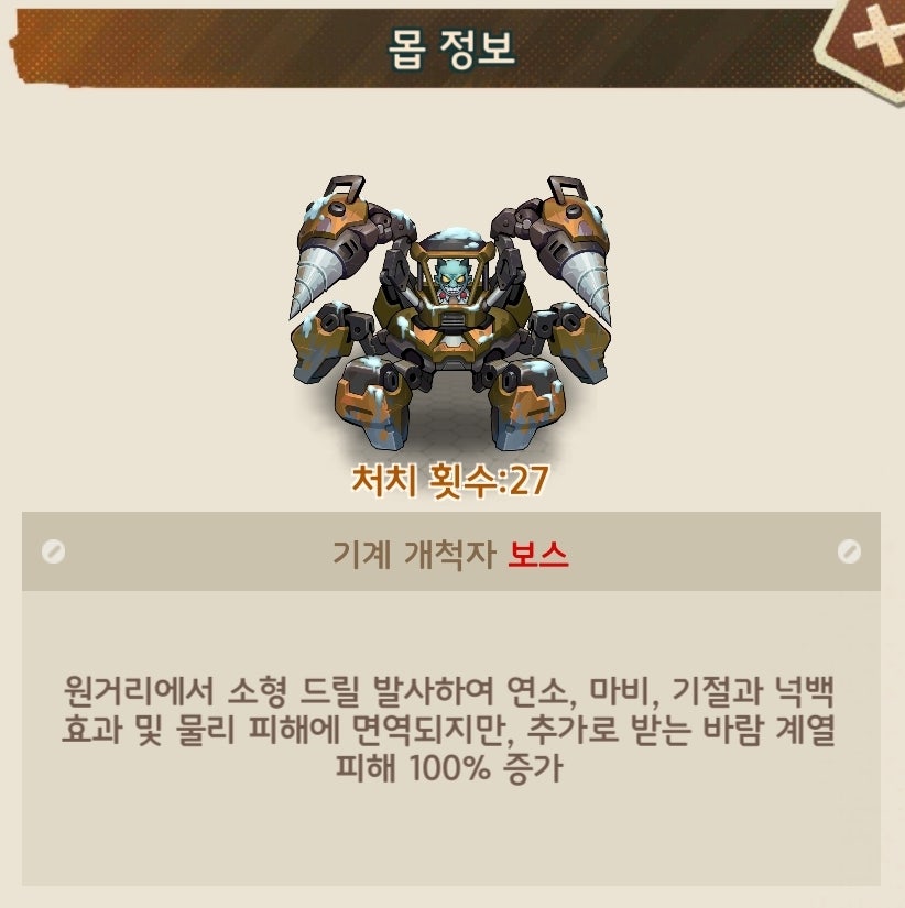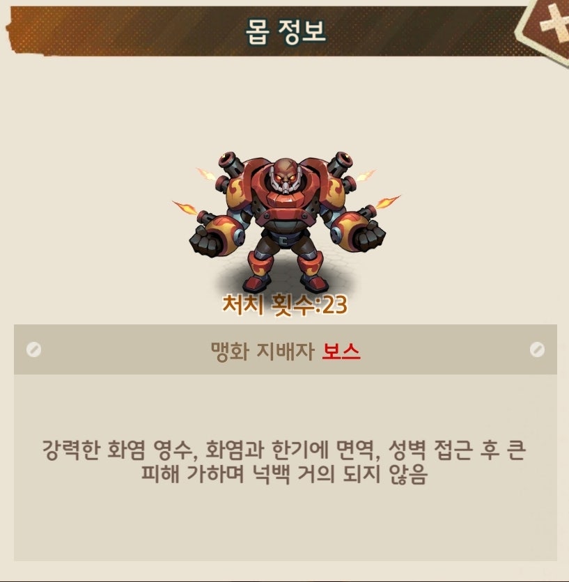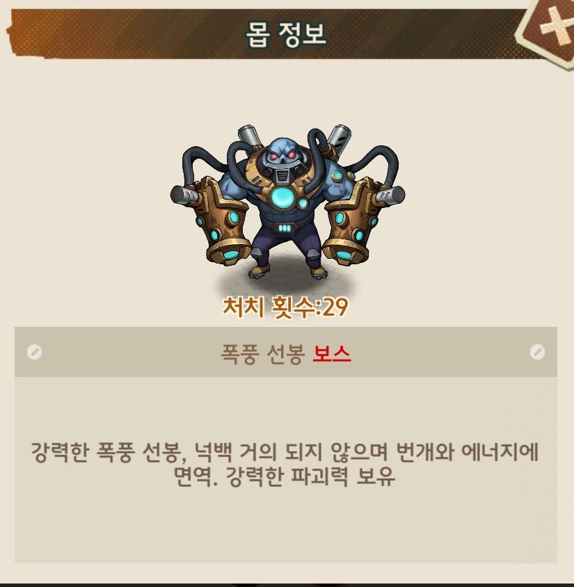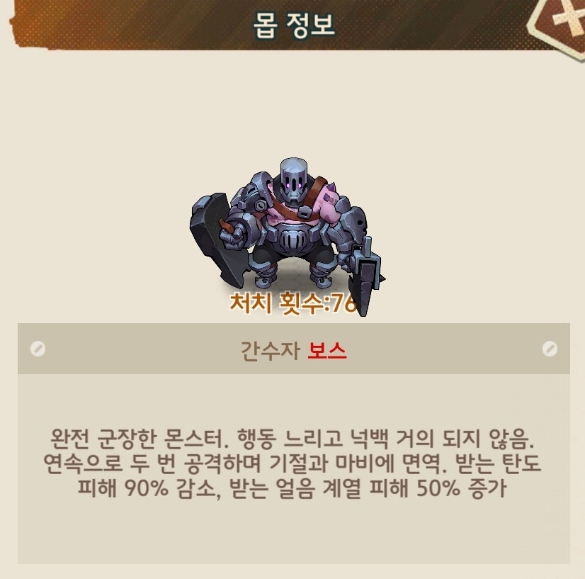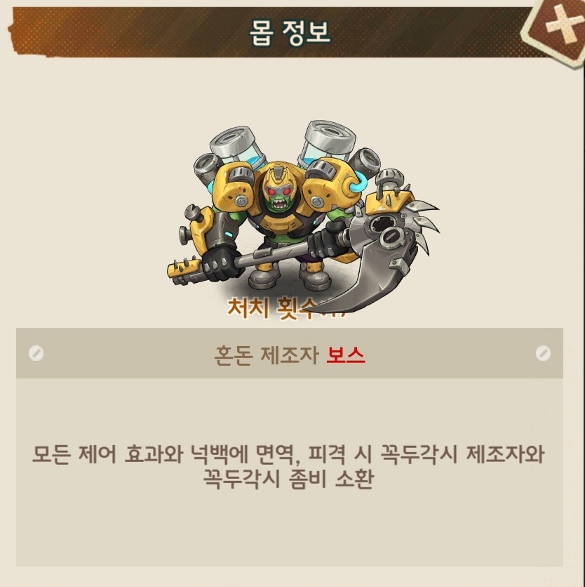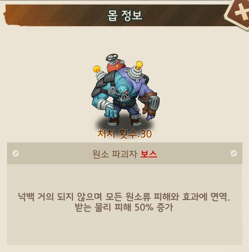 유저90%이상이 총과 열압탄이 메인인 덱으로 구성되어 있다보니 초반부에는 피통이 낮아 어렵지 않으나 후반부에 들어가면 괴랄한 피통으로 난이도가 급상승하는 보스입니다.