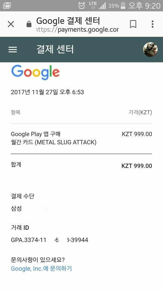 구글계정으로 로그인해서 저거대로하면 결제정보 확인창에서 결제한 내역 조회해서 아무거나 최근 결제내역 누르면 이렇게 결제내역이 나온다.